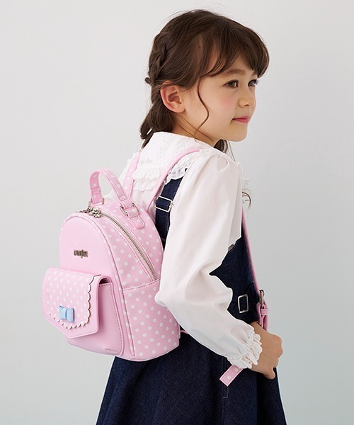 ポルカドットをちりばめたシンプルながらもポップで春らしいカラーリングのミニリュックです。フロントの配色リボンがデザインポイント。 本体サイズは流行の小さめリュックをトドラーサイズに縮小化して、ベストバランスなサイズに仕上げました。 ≪重さ≫F/約380g
