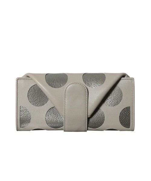 -LIMITED EDITION- 「IL PLATINO A POIS」 A POIS(アプア)…水玉の 牛革にラミネート加工と型押しを施した人気のPLATINO(プラーティノ)シリーズをアップデート。 倉庫に眠っていた素材を廃棄するのではなく、手間とデザインを加えドットのモダンな新しい商品に仕上げました。 デッドストックに新しい命を吹き込むヒロコ ハヤシのアップサイクル商品です。 【デザイン】 スマホや通帳、鍵などちょっとした収納も可能な<長財布> スナップボタンを外すとお財布全体が箱型の作りになっており、大きな小銭入れのように開きます。 スナップボタンは2つ付いているので、容量に合わせて調節が可能です。 小銭は開いたときに底になる大きな面で見れるので、いくら入っているかわかりやすく、取り出しやすくなっています。 そのため、小銭が出しにくく溜まってしまうということがなく、軽く、すっきりとした状態を維持でき、型崩れも防ぐことができます。 小銭の出し入れと同じ向きのまま、カード、お札が取り出せるので、無駄のないスムーズな動きで出し入れが可能です。 Dカン付で、別売りのロングチェーンを付けることで、ショルダーバッグのようにお使いいただけます。 ※チェーンは付属しておりません。 カード入れ:8箇所 / お札入れ:3箇所 / 小銭入れ:1箇所 / スナップボタン調節:2段階 【素材】 牛革にラミネート加工と型押しを施し、スムースのやぎ革で覆いました。 モデル情報:身長166cm B80 W59 H85 店舗へのお問い合わせ商品番号:709-21603 ●製品寸法: 00(FREE):H10cm W20.5cm D3cm 付属箱H11cm 付属箱W22cm 付属箱D5cm 備考:重量:約185g(サンプル重量)