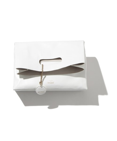 e-MOOK snidel 10thAnniversary P.32 小松 菜奈さん着用くりぬきハンドルのトートバッグと2つ折りのクラッチバッグ、どちらも楽しめる2WAYデザインのアイテムはシンプルで使い勝手GOOD。バッグインにぴったりのポーチとブランドネームをあしらったチャーム付きです。※商品画像はサンプルのため、色味や仕様変更がある場合がございますので、予めご了承ください。※チェーンの形が変わります。