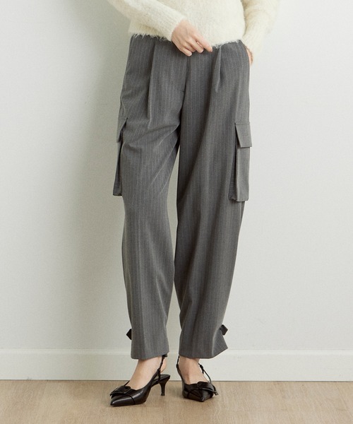 綺麗め見えするピンストライプ生地にあえて大き目のサイドポケットを施し、大人カジュアルに仕上げました。シャープな印象が演出できるストライプパンツは、裾に調節可能なボタンを付けており、シルエットの変化を楽しめます。 透け感:なし 伸縮性:あり 裏地:なし 光沢:なし ポケット:ありウエスト:後ろゴム仕様 洗濯方法:水洗い可