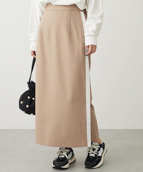 サイドにあしらわれたラインがスポーティーな風合いを演出するスカート。すとんとしたナローシルエットで、脚のラインをすっきりさせてくれます。裾にはスリットを施し、抜け感のある印象をプラス◎トップスをタックインしたメリハリのあるコーディネートがおすすめです。透け感[無し] 裏地[無し] 伸縮性[やや有り] 光沢感[無し] 生地の厚さ[普通] 付属品[無し] ポケット[無し]●製品寸法:F:ウエスト[後ゴム仕様]64-86cm ヒップ94cm 総丈89cm 裾幅49cm備考: