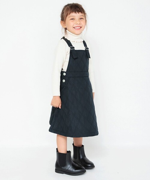 キルティング加工を施した秋冬には絶対重宝するジャンパースカートです♪ キルティングの柄もかわいいし、膝下丈の丈感が絶妙に仕上がったジャンパースカートです。 ウエスト回りはすっきりとしていて、裾口にかけてフレアーが入ったシルエットも動きやすさや右脇あき仕様で着やすさに配慮した設計です。 肩ひも調節可能だから着丈も調節できます。 肩ひも後側はクロスにしていて、肩がずれにくい仕様になってます♪ ----- 透け感:なし 伸縮性:なし ※モデル着用写真についてはイメージの為、実際の 商品とカラーや仕様が異なる場合がございますので、 商品画像をご覧ください。 ※商品の色味につきまして、お客様のお使いのPCの モニター環境により実際のカラーと画像の色味が 違って見える場合が御座います。 予めご了承の上、ご注文下さい。 ※店頭・外での撮影画像は光の加減で、 実際の商品より明るく見える場合が御座います。 子ども/子供/こども/子供服/キッズ/ジュニア/男の子/女の子
