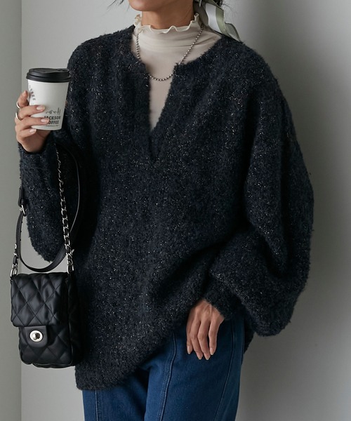 ふわふわと柔らかい生地にラメ感を効かせた華やかな表情のプルオーバーニット。 《ディテール》 ゆとりのあるワイドシルエットとドロップショルダーがリラックスした着心地をプラス。 深さのあるスキッパーデザインで、ナチュラルな抜け感を演出してくれます。 またふんわりとしたボリュームスリーブが女性らしい着こなしに仕上げてくれます◎ 装飾を省いたシンプルなデザインながらも、コーディネートの主役アイテムとして大活躍。 《スタイリング》 お手持ちのボトムに合わせるだけで、今シーズンらしいスタイリングが完成します! またシンプルなロンTやタートルネック合わせや、キャミソールを添えたさり気ない肌見せまでネックデザインを活かしたインナーレイヤードも楽しめます。 《ファブリック》 表面がふわふわと柔らかいブークレーニット素材を使用。 それほど厚手ではない為、ボトムにタックインもしやすいです。 --------------------------------- 透け感…淡色のみややあり 光沢感…ややあり 伸縮性…あり 裏地…なし 生地の厚さ…普通 --------------------------------- ≪ お買い物をお楽しみいただくために ≫ ▼ 商品のお気に入り登録 完売カラーの再入荷通知やラスト1点の通知、セールの通知も受け取ることができます。 ▼ ブランドのお気に入り登録 新商品や再入荷等、いち早くブランドのお得な情報を受け取ることができます。 【 Anss.me / アンスミー 】 -今の気分に答えたい- 自分らしく気軽にトレンドを楽しむワードローブに取り入れられるファッションを提案します。 ※ご覧のモニター環境や撮影環境や光の当たり具合で実際の商品と色味が異なって見える場合があります。