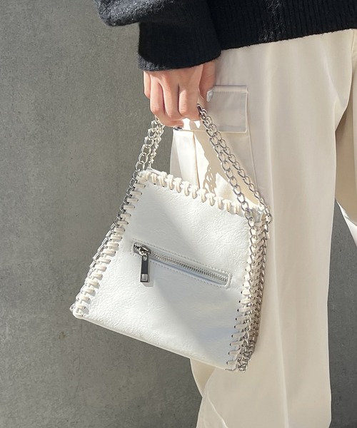 チェーンがアクセントの新型バッグが登場。ハンドルと側面に施されたチェーンがアクセントになった小型バッグ。付属ショルダーがついており、2WAY仕様が可能です。コンパクトタイプですが、外側にもファスナーポケットがついており収納も◎<br>シンプルな色合いながら存在感のあるバッグは、キレイメにもカジュアルにも、お洋服のアクセントになるアイテムです。☆★お買い物をお楽しみいただく為に★☆★商品のお気に入り登録完売カラーの再入荷通知や、ラスト1点の通知、セールの通知も受け取ることができます。★ブランドのお気に入り登録新商品や再入荷等、ブランドのお得な情報をいち早く受け取ることができます。
