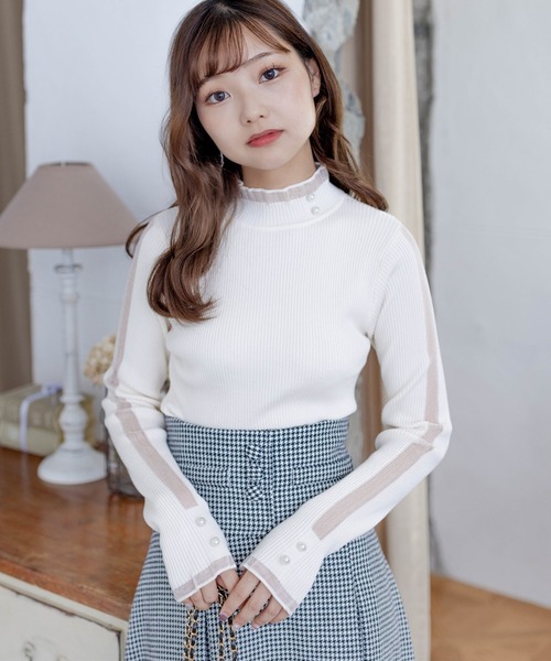 透け感が可愛い!シアーフリルネックリブニットトップス【デザイン】袖部分のラメの入ったシアー素材が上品な女性らしさを引き出してくれます!首元と袖口部分のビジューボタンもポイントです!一見シンプルに見えますが、デザイン性があるので1着で決めていただけます♪【素材感】肌触りのいいレーヨンニット素材伸縮性:あり/ 透け感:シアー部分,アイボリーのみ若干あり/ 裏地:なし 水洗いによる洗濯不可 / ドライクリーニング可【コーディネート】タイトなシルエットになるので、フレアスカートやミニスカートでラインをきれいに見せていただくのがおすすめ!スキニー合わせで甘辛コーデにも!【※お取り扱い上のご注意】1:モニター環境等により実際の商品と多少色味が異なって表示される場合がございます。予めご了承下さい。2:屋外で撮影された商品は、天候により多少実際のカラーと異なる場合があります。商品のカラーはトルソー(マネキン)の商品画像をご参照ください。3:濃い色の商品は、お洗濯や摩擦等による移染にご注意ください。4:末永くご愛用頂く為に、アテンションタグ・洗濯ネームを必ずご確認の上、着用又はお取り扱い下さい。5:生産時期により、色、サイズ、デザイン、素材の質感が多少が異なる場合がございます。あらかじめ御了承下さいませ。