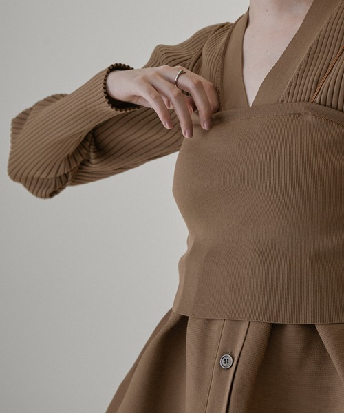 華奢なストラップが女性らしい、インナーとしてもレイヤードアイテムとしても活躍するニットビスチェ■デザイン/シルエット スタイリングのアレンジが広がるニットビスチェ。 シーズレスな素材感で季節を問わず着て頂けます。 華奢なストレッチの肩紐もこだわりポイント。大人の女性にオススメです。 ストラップの取り外しはできませんが中に入れ込むことで肩紐有無しの着こなしも可能です。 インナーとしてだけではなくビスチェとしてレイヤードスタイルにも活躍します。 シックなブラック、軽やかなライトグレー、秋冬にぴったりなキャメルの3色展開です。 ■素材 リサイクルポリエステルを使用したエコな糸を使用。 見た目以上の軽さと美しいフォルムを表現できる素材です。 ご自宅で手洗い可能なのも嬉しいポイントです。 ■コーディネート 同素材のカーディガンとセットアップでの着用が可能。 インナーとしてはもちろん、上からレイヤードしたビスチェスタイルも決まります。 同色で合わせたりあえて異なるカラーの組み合わせを楽しむのも◎ 華奢なストラップが見えても素敵なのでお手持ちのアイテムとも合わせやすい1枚です。 ■同素材のVネックカーディガンもございます。 商品番号:SHK33910 商品名:リブフレアーペプラムカーディガン【セットアップ対応・洗える】 ■モデル身長:170cm 着用サイズ:F(ショートヘアモデル) ■モデル身長:172cm 着用サイズ:F(ロングヘアモデル) ----------------------------- 裏地:なし 光沢感:なし 透け感:なし 伸縮性:あり 生地の厚さ:やや厚手 ストラップ調整:不可 ※パッドやカップはついておりません -----------------------------