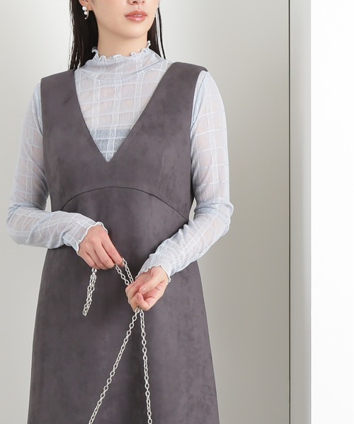 【松井愛莉さん着用】【川津明日香さん着用】やさしいカラーのチェック柄がアクセントになるシアーカットソー。ハイネックインナーとして、キャミワンピースやビスチェなどのレイヤードスタイルをいっきに今年顔に仕上げてくれます。ほんのり透け感があるため、手持ちのインナーを着ていただくと安心です。襟ぐり、袖口、裾のメロー加工も見せるポイントになって、大人っぽくフェミニンさを感じられる一枚。**********************透け感:ややあり裏地:なし伸縮性:ややあり光沢感:なし生地の厚さ:薄手**********************