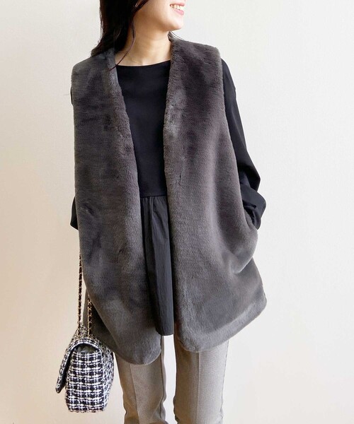 手持ちのアイテムに羽織るだけで様になる、フェイクファーベスト 【デザイン】 ・一枚羽織るだけでコーディネートを今年らしくアップデートできる、トレンド感のあるアイテム。 ・カットソーやニット、ブラウスはもちろん、ワンピースとも相性が良く、ボトムを選ばず着られます。 ※ポケット数:横×2 【素材】 ・毛足が長すぎない、ほどよいフェイクファーで大人っぽく着られます ※裏地あり こちらの商品は主に秋に着用いただける商品です。 モデル情報:身長168cm B76 W58 H86 着用サイズ:00 店舗へのお問い合わせ商品番号:637-47010 ●製品寸法: 00:着丈76cm B102cm 肩幅37cm 備考:重量:(FREE)約465g