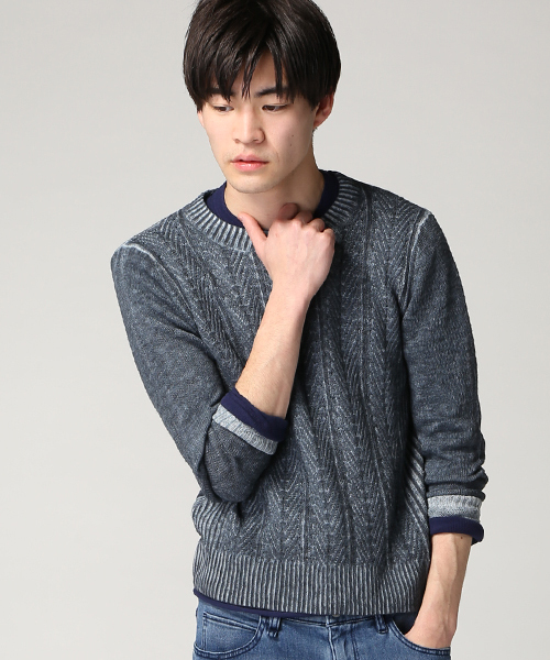 JOURNAL STANDARDのニット 風合いの良いドライな質感が特徴のコットン・リネン素材を使用したクルーネックニット。 トラディショナルなケーブル編みデザインに顔料染めのスプレープリントを施した立体感のある表情が魅力の仕上がりで、トップスやインナー、レイヤードなど、カジュアルから様々なスタイリングにご使用頂けるアイテムです。 【お取り扱い注意】 この製品は特性上色落ちしやすいので下記の点にご注意ください。 ・濡れたままの放置は避けて下さい。 ・他のものと一緒に洗濯しないで下さい。 ・湿った状態で白物とこすり合わせると、色が移るおそれがあります。 ・通常でも、淡色との着用で色移りする可能性がございますので、色が落ち着くまでは濃色のものと合わせてください。