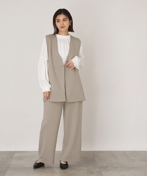 ■ポイント/詳細 ジレとパンツのセットアップアイテムです。 ジレはW前風の仕上がりでマスキュリンな着こなしが実現。 パンツはウエストゴムのワイドシルエット。 ※ポケット数:ジレ横×2、パンツ横×2 ■素材/機能性 滑らかなタッチで中肉のダンボール素材を使用しております。 ジャージ素材なので伸縮性もあります。 ※裏地なし ■おすすめコーディネート セットアップでも、別々で単品でもコーディネート出来、着回し◎の1着です。 ジレにはブラウスを合わせるとお仕事スタイルに、Tシャツを合わせるとデイリーな着こなしにと、幅広く着回しして頂けます! こちらの商品は主に秋に着用いただける商品です。 モデル情報:身長163cm B80 W58 H87 着用サイズ:12(M) 店舗へのお問い合わせ商品番号:040-57015 ●製品寸法: 12(M):ジレ着丈72cm ジレB94cm ジレ肩幅36cm パンツW62~70cm パンツH96cm パンツ股下65cm パンツ前股上34cm パンツ渡り幅33cm パンツ裾幅28cm 13(L):ジレ着丈74cm ジレB98cm ジレ肩幅38cm パンツW68~74cm パンツH100cm パンツ股下66cm パンツ前股上34cm パンツ渡り幅34cm パンツ裾幅28cm 備考: