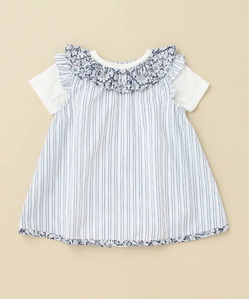 さわやかなストライプ柄でまとめたワンピースとボディスーツのセットです。 ワンピースの衿にはリバティファブリックをあしらい、華やかな印象をプラスしました。 ボディスーツの生地は触れた時にひんやりと感じる「コンフォートクール」素材を使用しており、夏場でも快適に着ていただけます。 ワンピースは衿ぐりが総ゴム仕様、ボディスーツは後ろ衿ぐりがゴム仕様なので、お着替えもスムーズです。 【おすすめの着用時期は春夏シーズン】 【透け感】透けない※ボディスーツはやや透ける 【生地の厚さ】普通 【伸縮性】なし※ボディスーツは伸縮性あり 【裏地】なし 【ポケット】なし 【アジャスター】なし※ボディスーツは股下に調節釦有り