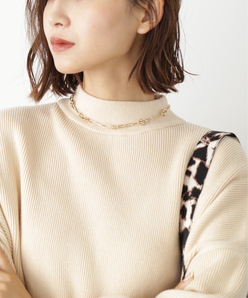 異なるパーツをMIXしたショートチェーンネックレス。モチーフ付きチェーンを繋げてポイントを効かせた、ややボリューム感のあるアクセサリー。通常のチェーンネックレスとは違った雰囲気なので、新鮮なポイント使いができます。シンプルになりがちなコーディネートのアクセントにお勧め。※モデルの着用画像の場合、光の当たり具合により、実際の色味と異なって見えることがございます。色味は、商品単体の画像をご参照ください。