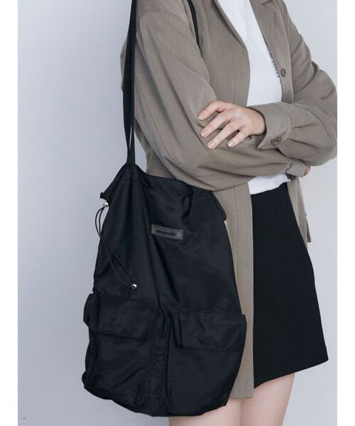 ナイロン素材のトートBAGです。 アウトポケットデザインとシリコンワッペンの今季らしいディテールがポイントです。 サイドはドローストリングでデザインで、絞って使用する事も出来ます。 素材は、ナイロンツイルで上品な微光沢でカジュアルさを押さえています。 生地の風合いをいかし、クタっとした雰囲気で持てるのでこなれ感が出るのもポイントです。