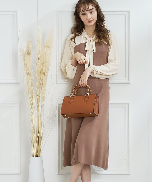 お仕事着にも使える!一枚でレイヤードしたようなこなれスタイルが叶う、デザインニットワンピース。 ~POINT~ ・異素材ドッキングすることで動きのあるデザインに仕上げました。トップス部分がブラウス素材なので秋始まりからすぐにお使いいただけます。 ・体のラインをきれいにみせてくれるシルエットにこだわりました。 ・ミディ丈なので低身長さんも綺麗に着用していただけます。 【ディティール・機能】 ・やわらかく落ち感が特徴的なシフォンジョーゼットに、程よい肉感のある総針ニットをドッキング。 ハンドウォッシャブル機能付き。 ※裏地なし ※布帛部分はやや透け感があります。 ※ポケットなし 【スタッフコメント】 ・maki(163 ) 一枚で重ね着風のデザインが楽しめる、着映えワンピースです。 秋始まりのまだ気温が高いシーズンも、上身頃がブラウス素材なので気温調節し易い◎ アウターを羽織って長く着回しして頂けます。 モデル情報:身長167cm B80 W59 H82 着用サイズ:38(M) 店舗へのお問い合わせ商品番号:508-57024 ●製品寸法: 36(S):着丈108cm B83cm 袖丈55cm 肩幅36cm 38(M):着丈110cm B86cm 袖丈56cm 肩幅37cm 40(L):着丈112cm B89cm 袖丈57cm 肩幅38cm 42(LL):着丈114cm B92cm 袖丈58cm 肩幅39cm 備考: