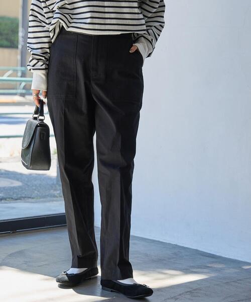 定番アメカジスタイルにマッチするベイカーパンツ■デザインシンプルなテーパードベイカーパンツ。伸びのある素材を使い、ウエストは後ろゴムのイージーウエストにし、履き易さと履き心地にこだわった一本です。くるぶし丈の設定でセンタープレスを入れて大人っぽく仕上げています。■素材独自の表情がポイントのバックサテン素材を使用。しっかりと張りのある素材ながら、適度な伸びがあり、履き心地は◎です。■スタイリングシーズンレスで着こなしに取り入れ易いカジュアルパンツですが今年はキレイ目に合わせて大人のスタイリングがおすすめ。足元にはパンプスやバレエシューズ、冬にはショートブーツなどで大人カジュアルにまとまります。透け感:なし生地の厚さ:やや厚い光沢感:なし裏地:なしウエストゴム:ありサイドポケット:あり家庭洗濯:可能(ネット使用)【注意点】※撮影商品はサンプルの為、実際の仕様と異なる場合がございます。※画像の商品は光の照射や角度、お使いのモニター環境により、実物と色味が異なる場合がございます。スタジオ物撮りの画像が実物の色味に一番近くなっております。※予約商品の場合、お届け予定はあくまでも目安となります。生産の都合上、お届け時期が前後したり実店舗入荷時期とずれる場合がございますので、あらかじめご了承ください。品名:バックサテン ベイカーパンツ 品番:7640-635-0290