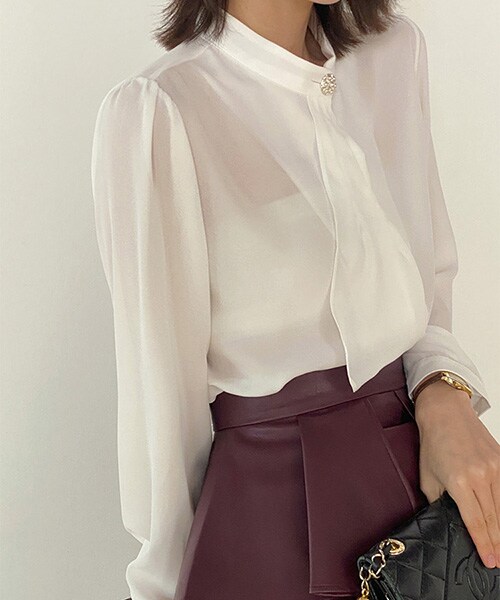 首元に華やかなポイントが効いたブラウス✨ とろみ素材できれいめコーデに使えます。 スラックスやIラインスカートにインして♪ ・中央&袖口(スリット)ボタン開閉可 ・パフ×長袖 ・バンドカラー ・センターボックス ・ボウタイ ・首元フェイクパールボタン開閉可