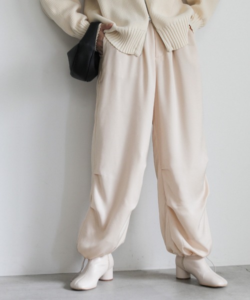 -point- & -styling-カジュアル過ぎず女性らしく着用可能なドロストイージーカーゴパンツカジュアルなカーゴパンツを滑らかなサテンライクの生地を使用して女性らしく仕上げたアイテム。程よくゆとりのあるシルエットで足のラインを拾いにくく、イン/アウトどちらもサマになるシルエット。裾はギュッと絞ったり、そのまま伸ばしても着用可能で異なる印象で楽しめる2WAY仕様です。ご自宅でお手入れ可能なイージーケアもうれしいポイントです。ジャケットやシャツなどのきれいめなアイテムを合わせたり、オーバーサイズのニットにブーツを合わせるスタイルもおすすめ。ワイドシルエットサテンライクリラックスパンツ----------------------------素材 (表地)ポリエステル100% (裏地)ポリエステル100%----------------------------伸縮性 なし生地の厚さ ★★☆☆☆裏地 あり----------------------------※モニター・環境等により実際の商品と多少色味が異なって表示される場合がございます。 予めご了承をお願いいたします。=======================■袋梱包の為、染料による特有の匂いが抜けきれず、匂いがする場合がございますが不良品にはあたりません。 上記注意点での返品、交換はお断りします。ご了承の上お買い求めくださいませ。■本製品は生産過程におきまして色味、サイズ感等若干の誤差が出る場合がございます。予めご了承くださいませ。=======================【お買いものをお楽しみいただく為に!】▼商品のお気に入り登録完売カラーの再入荷通知や、ラスト1点の通知、セールの通知も受け取ることができます。▼ブランドのお気に入り登録新商品や再入荷など、いち早くブランドのお得な情報を受け取ることができます!