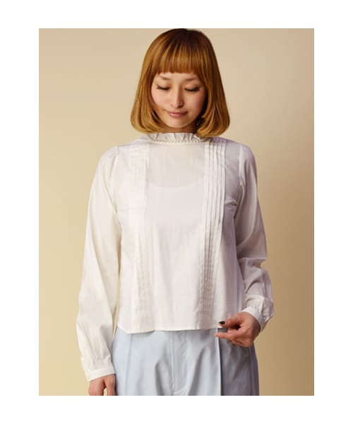 衿ぐりのパールがポイントのブラウス。ピンタックデザインなのですっきりとした印象です。クロップドパンツとトレンチコートでマニッシュにコーデするのもオススメです。ネイビーはデニム生地になります。※後ろ開きになります。【ご注意】デニム生地は特性上、他の洋服に色移りする可能性が御座います。