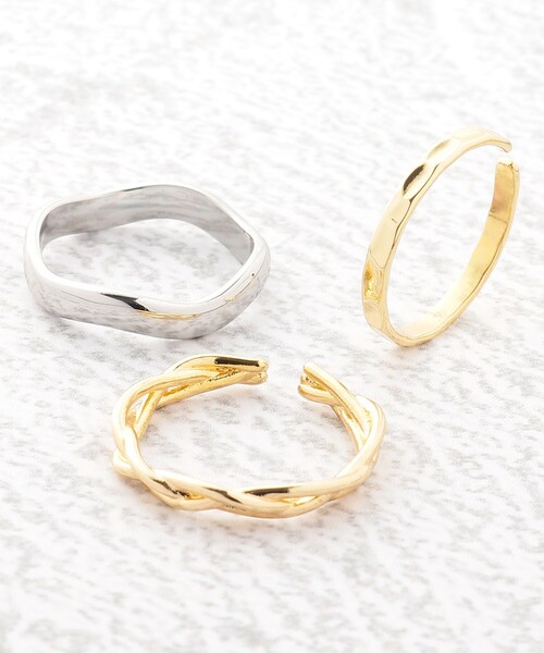 ニュアンスのあるリングを3連に組み合わせたファッションリング 【デザイン】 存在感のあるデザインのリングを3種類組み合わせたリング。 今期トレンドのメタルミックスで組み合わせました。 3本中2本はサイズ調整ができるリングにしています。 店舗へのお問い合わせ商品番号:769-87071 ●製品寸法: 00:号数12号 幅0.3cm 備考: