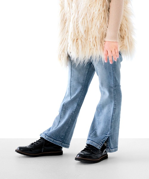 [150~160もあります]裏面パイルのソフトな感触と、大人顔負けの加工感が特徴のニット風デニムを使用したフレアパンツ。ケミカルウォッシュと定番デニム加工の2色展開。美しいシルエットと、フロントの切り替えラインやスリットが、トレンド感の高い着こなしに活躍します。ウエストゴム取り替え口有り 調整可L.COPECK (エルコペック)岡山デニム・・・国産ジーンズ発祥の聖地である岡山県倉敷市の子供服メーカーで1986年のブランド設立より30余年の歴史の中で培われた確かな技術と共に、国内、海外問わず素材開発から縫製・検品までを一貫して自社で行う事で高い品質を実現しています。感度の高いトレンドテイストのデザインから定番のアメカジベーシックデザインまで幅広く網羅し、ボトム製造に特化したメーカーならではのこだわりのモノ作りを発信して行きます。