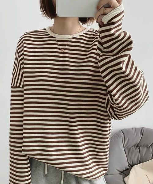 《ゆったり着れる今年らしいボーダープルオーバー》■デザイン・ビッグシルエットと細めのボーダーで大人のカジュアルスタイルにマッチします。・おうちでゆっくりしたいときにもオススメです!・ドロップショルダー、長めの袖丈で今年らしい抜け感のある雰囲気。■素材柔らかい生地感で毎日でも着たくなる素材感です。■スタイリングどんなボトムとも相性が良く、長めの丈感がインスタイルでもアウトスタイルでも楽しめます◎ボリュームのあるワイドパンツでリラクシーなスタイリングもおすすめ。