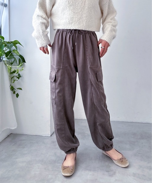 スポーティー感控え目なカーゴパンツ マットで肌触りの良いスエードポンチ素材はどこか女性らしい雰囲気のある印象に。 ゆったりとしたサイズ感ながらも、落ち感のある生地なので横の広がりが出にくくストンと収まりの良いシルエット。 シャカシャカするナイロン素材やメンズっぽくなりすぎるのが苦手な方へもオススメです。 COORDINATE 秋には女性らしいブラウス、冬には起毛感のあるニットもオススメ。 ローファーやフラットなパンプスで足の甲を出すことで抜け感を出しても。 裾にギャザーの入ったデザインなのでショートブーツ合わせも相性抜群です。 DETAIL 厚み:★★★☆☆ 温かさ:★★★★☆ トレンド感:★★★★☆ 着回し力:★★★★☆ SEASON 秋,冬,春 ※照明や天候、閲覧環境によって実際の色味と異なって見える場合がございます。予めご了承ください。 … information … 欲しいitemをお気に入り登録(♡マークをclick) ・お買いのがし対策…完売itemの再入荷やラスト1点の情報をお知らせ ・欲しいitemをお得にget…price downになったらいち早くお知らせ ・スムーズ検索…ZOZOのお気に入りアイテムページで簡単checkできるから、再検索不要♪