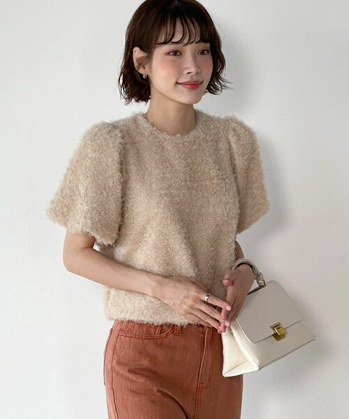 コーデを華やかにまとめるブラウス✨ 立体感が愛らしく二の腕もカバー! デニムやきれいめのスカートと相性◎ ・ブークレ素材 ・パフ×半袖 ・クロップド丈 ・袖口ゴム ・ラウンドネック×クリアビーズ装飾 ・首後ろボタン開閉可(スリット)
