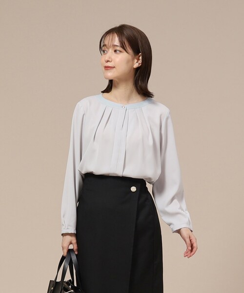 【CIRCRIC】とはワールドグループのサステナブル素材のブランドです。【デザイン】バンドカラー風の衿元がポイントのブラウス。襟元はタックでふんわりとしたシルエットをつくり、ジャケットインに映える立体感を出しています。上品な配色で清潔感があり好印象。【スタイリング】セレモニーや通勤などきれいめスタイルから、カーディガンのインナーなどデイリーなスタイルまで幅広いテイスト・シーンで着用いただけます。【素材】さらりとした肌触り、とろみ感がある素材を使用しています。#通勤#セレモニー#ママスーツ#入卒#卒園式#卒業式#入学式#入園式#学校訪問服#パーティドレス#フォーマルレディス#結婚式#七五三#ママ#母スーツモデル情報:身長166cm B80 W59 H85 着用サイズ:02(M)店舗へのお問い合わせ商品番号:C62-81402●製品寸法:01(S):着丈58cm B108cm 袖丈51cm 肩幅38cm02(M):着丈59cm B111cm 袖丈52cm 肩幅39cm03(L):着丈60cm B114cm 袖丈53cm 肩幅40cm04(LL):着丈61cm B117cm 袖丈54cm 肩幅41cm05(3L):着丈62cm B120cm 袖丈54cm 肩幅42cm備考: