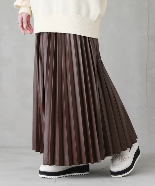 フェイクレザー×アコーディオンプリーツの甘辛ミックスなデザイン性。こなれたスタイリングになるロングスカート。 プリーツ幅をウエストから裾に向かって広げることで、揺れ感のある理想的なシルエットに。 実用性のあるベルトループ付き。 ウエスト総ゴム仕様で穿き心地は楽ちんです。 柔らかな質感で、光沢感のあるフェイクレザー生地を使用。 程よい厚みと重すぎない素材感でひらっとした印象に。(スカート重量 約600g) 透け感の心配がない裏地付きです。 ≪n'OrLABEL≫フェイクレザープリーツスカートです。 ※素材の特性上、独特なにおいがする場合がございます。 においが気になる場合はご着用前に一度、天日干しをしていただくことをお勧めします。 ご了承の上ご購入いただきますようお願いいたします。