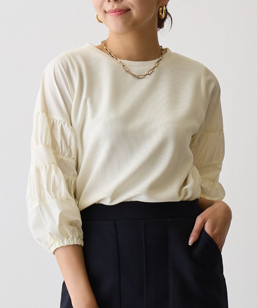 さりげないお洒落感!異素材ドッキングプルオーバー ギャザースリーブがアクセントのプルオーバーです。 しっとりと肌触りの良いボディーに異素材の袖をドッキング。 同色のコットンギャザーが軽さと女性らしさを演出。さり気ないオシャレ感が漂います。 袖口はゴムになっています。お好きなポイントでシルエット楽しんで下さい。 アイボリーとブラックの2色展開です。 --------------------------------- 透け感:なし 裏地:なし 伸縮性:なし 光沢感:なし ポケット:なし --------------------------------- ※照明の関係により、実際よりも色味が違って見える場合があります。 またパソコン・スマートフォンなどの環境により、若干製品と画像のカラーが異なる場合もございます。