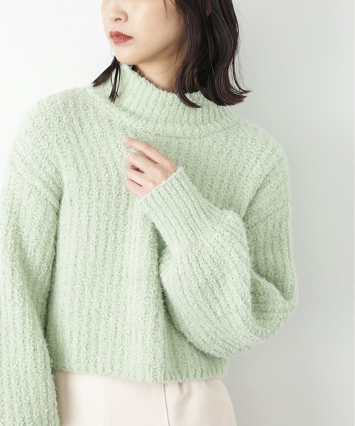 ふんわりとした表情がかわいいショート丈のハイネックニット。フェザーとモールを引き揃えた編地で、モチモチ&フカフカとした肌触りのよさが特徴。ハイネックなので首元があたたかく、袖はふんわりとボリュームをもたせたデザインです。身頃から袖につながるヨコ編みの一体感のあるスリーブラインがポイント。ショート丈なので、ハイウエストボトムスと合わせれば、バランス良く着用いただけます。■透け感:なし■生地の厚さ:普通■裏地:なし■伸縮性:あり■光沢:なし■シルエット:スタンダード※モデルの着用画像の場合、光の当たり具合により、実際の色味と異なって見えることがございます。色味は、商品単体の画像をご参照ください。------------------------------------------------------◆商品のお気に入り登録◆ お気に入りアイテムの値下げ・再入荷・在庫1点などの通知を受け取ることができます。◆ブランドのお気に入り登録◆新商品や再入荷、セール、クーポン配布などお得な情報を受け取ることができます。------------------------------------------------------