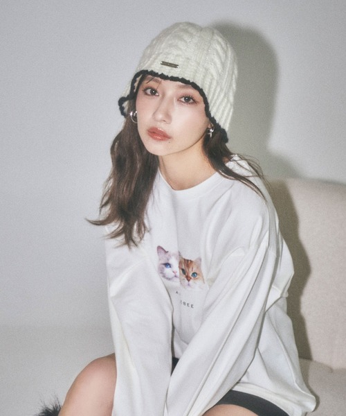 ANDGEEBEEのプレートが付いたニット素材のバケットハット。