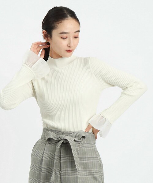 袖にあしらったオーガンジー素材がアクセント 一枚でもインナーでも活躍する、リブハイネックニット 【デザイン】 ・シンプルで着回しの効く、リブ編みのハイネックニット ・程よいハイネックデザインで、一枚ではもちろんジャンスカやキャミソールブラウスとのレイヤードもオススメです ・袖口にオーガンジー素材をあしらった、程よいフレアスリーブデザイン 【素材】 ・レーヨンとポリエステルを混紡した、きれいめにも着こなせるすっきりとした素材感 ・ハンドウォッシャブルでご家庭でのお手入れも可能です こちらの商品は主に冬に着用いただける商品です。 モデル情報:身長168cm B76 W58 H86 着用サイズ:38(M) 店舗へのお問い合わせ商品番号:637-17060 ●製品寸法: 36(S):着丈58cm B66cm 袖丈60cm 肩幅28cm 38(M):着丈61cm B68cm 袖丈62cm 肩幅31cm 備考: