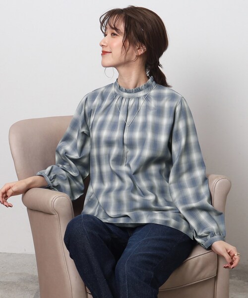 【デザイン】 秋らしい配色がかわいいトレンド感のあるチェックブラウスです。 首元が華やかに見えるフリルカラーがデザインポイント。 スッキリとした肩回りが身体を華奢に魅せてくれる一枚です。 脇にスリットが入っており、ボトムにインしてもアウトしても使いやすくなっています。 モールケーブルカーディガンなどボリュームのある羽織ものとの相性がよく、スタイリングも決まりやすいです。 【素材】 さらっとした肌触りの良い素材を使用しています。 モデル情報:身長166cm B80 W59 H85 着用サイズ:02(M) 店舗へのお問い合わせ商品番号:C62-87015 ●製品寸法: 02(M):着丈64cm B100cm 袖丈56cm 肩幅37cm 03(L):着丈67cm B104cm 袖丈56cm 肩幅38cm 04(LL):着丈70cm B108cm 袖丈57cm 肩幅40cm 備考: