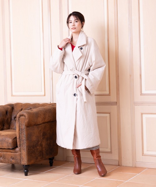 ボリュームのあるふっくらしたシルエットが特徴のコート。襟元をすっきり見せてくれるハンサムなテーラーカラーデザイン。ボリュームのあるトップスの上にも着れるゆったりしたサイズ感です。ベルト付きなのでウエストマークをしてスタイルチェンジ可能。 透け感:なし 伸縮性:なし 裏地:あり 光沢:なし ポケット:あり洗濯方法:ドライクリーニング ■サンプル撮影商品■こちらの商品はサンプルでの撮影となっております。実際の商品とは、サイズや色味、素材、デザイン等の仕様が若干変更になる場合がございます。