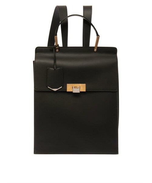 Black, smooth calf leather One top handle, brushed gold-tone metal hardware Two adjustable buckle-fastening shoulder straps Front flap closure Logo-engraved two-tone palladium and brushed gold-tone metal clasp fastening Detachable hanging leather-encased mirrored metal One internal zip and slip pocket Black leather lining Country of Origin: Italy