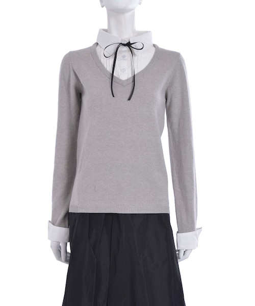 シャツとニットが、ドッキングされているトップス。1枚でレイヤードが楽しめるアイテムです。取り外し可能なリボンは、気分に合わせての着用がおすすめです。