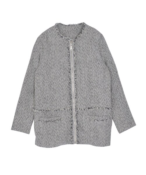 デニムをイメージしたツィードを使用したノーカラージャケットです。切り替えや衿ぐりにフリンジを施しトレンド感をプラスしています。同じシリーズのDENIM TWEEDコクーンS-PTとSETで着て頂くスタイルもおススメです。【モデル身長:177cm】【予約販売商品】配送予定時期: 3月下旬予定※ご予約商品は、商品入荷次第の発送となっております。配送予定時期は、商品の入荷状況により前後する場合がございます。入荷次第ご注文順のお届けとなりますので、予めご了承お願い致します。※こちらの商品はDENIM TWEED ハイウエストショートパンツと同時購入ができます。※商品画像は、サンプルでの撮影のため、色味や仕様の変更がある場合がございますので、予めご了承ください。※予約商品の場合、サイズ・混率の表記がない場合がございますのでご了承をお願い致します。また、サイズ・混率については変更になることがございますので、 予めご了承をお願い致します。