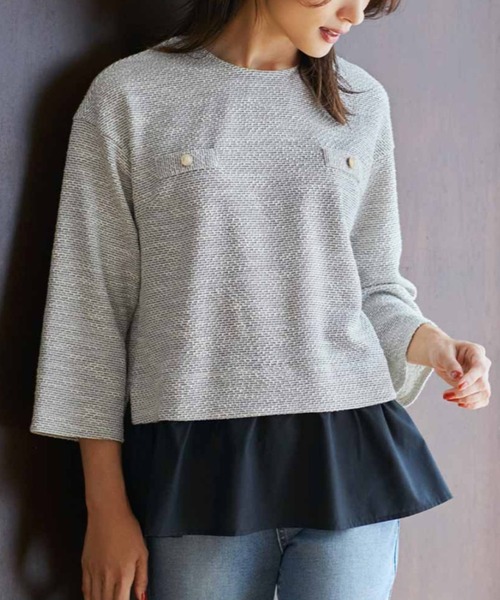 ツイードの着映え感をスウェット感覚で楽しめたなら…… そんな願いをカタチにした、気負わずデイリーに着こなせるトレンドトップスが完成。 ラメ糸をミックスしたカットソーツイードは、伸びやかな着心地で、お出かけ感も満点の華やかさ。 胸の飾りポケットとエンブレムボタンでトラッド感を高めつつ、すそを布はくのフレアーで切り替えて、フェミニンさも加えました。 ほどよく長めの丈感で、気になる腰まわりも目隠し。 デニムやカーゴパンツでカジュアルダウンさせる着こなしがおすすめです。 ■FROM IEDITプランナー ー 生地の厚さ:ほどよい厚みです。 - 透け感:ありません。 - 伸縮性:身ごろ部分はあり、すその布はく部分はありません。 - コメント:布はくのツイード素材に見えて実はカットソーなので、伸びやかな着心地。あまり厚みがないので、秋らしい素材をまだ暑い時期から楽しめる一枚です。