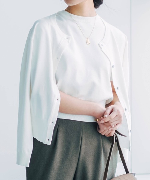 着回し自在なニットアンサンブル。シンプルな半袖ニットと長袖カーデのセットで、オンオフ問わず活躍間違いなし!カーディガンはインナーを選ばずあたりの出にくい可愛めシルエット。裾リブを大きくとっているのでウエスト回りもスッキリ♪重ね着はもちろん、単品でも使える優秀アイテムでコーデの幅がグッと広がります。