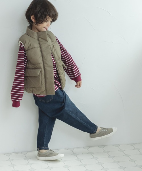 丸っこいころんとしたフォルムが可愛らしい中綿ダウンベストが今季新しく登場しました。首元をカバーしてくれるスタンドネック仕様で機能性もばっちり。両サイドには大きめのポケット付きでコーデのアクセントになります。袖・裾口ゴム入り仕様でモコモコしたシルエットを演出し、これ一枚でいつものコーデを格上げしてくれます。【スタイリング】どんなアイテムとも重ねやすい中綿ベストはカジュアルにスウェットとの組み合わせがおすすめ。シンプルな無地デザインなので、柄物ニットとの相性も可愛らしく決まります。通園通学はもちろんちょっとした外出にオススメのアイテムです。生産時期により色味が若干異なる場合がございます。ご了承ください。【濃色品・色移り】濃色品は、色落ち・色移りをする恐れがあります。摩擦(特に湿った状態での摩擦)や汗や雨などで他の衣料や下着(特に白物)に色移りしますので、十分ご注意ください。【ポケット】あり(両サイド)【伸縮性】なし【透け感】なし【クリーニング】手洗い可【裏地】あり