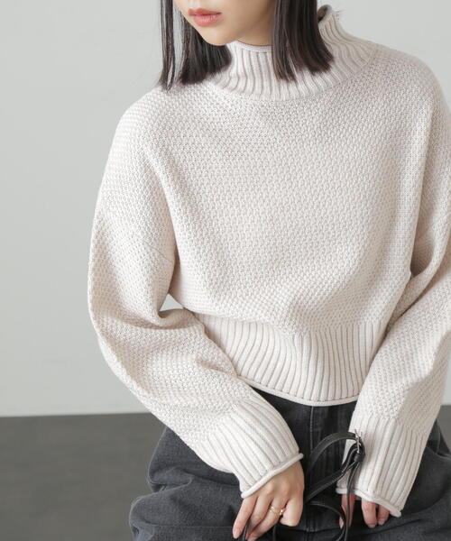 Free's Martでご好評いただいているショート丈ニット。 カジュアルに着こなせるタートルネックは、4種類の素材をMIXさせて、ふんわりとやわらかい質感を実現しました。 表面感のある鹿の子編みに、衿元、袖口、裾にリブ編みでメリハリをきかせて着やすさも抜群。 着丈はほどよいショート丈なので、ハイウエストボトムスとも相性バツグンです。 〇透け感:なし 〇生地の厚さ:普通 〇裏地:なし 〇伸縮性:ややあり 〇光沢:なし 〇シルエット:スタンダード ※130/ライトグリーンカラーは新宿ルミネエスト店・北千住ルミネ店・EC限定販売カラーです。 ※モデルの着用画像の場合、光の当たり具合により、実際の色味と異なって見えることがございます。色味は、商品単体の画像をご参照ください。 ※ピリングに御注意ください。ピリングは、着用中の摩擦作用により出来た毛玉のことで、これは素材の特性上着用の際避けられない現象です。 ピリングが出来ましたら、ブラッシングか、小さなハサミで1つ1つ取り除いて下さい。 ------------------------------------------------------ ◆商品のお気に入り登録◆ お気に入りアイテムの値下げ・再入荷・在庫1点などの通知を受け取ることができます。 ◆ブランドのお気に入り登録◆ 新商品や再入荷、セール、クーポン配布などお得な情報を受け取ることができます。 ------------------------------------------------------