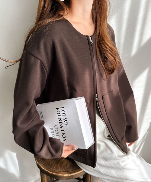 裏フリース素材がやわらかくて暖かい、 ノーカラーブルゾンが入荷しました♪ 表面はコットン混の天竺編みですっきりと、 裏面はやわらかくて暖かいフリースを採用♪ カーデ感覚で着られる、1枚仕立てで、 軽い着心地をこだわりました◎ フロントはダブルジップ仕様で、 お好みのバランスで着用できるのも◎ 便利なアウトポケット付き。 パターンにこだわった立体的なランタンスリーブは、 さらっと羽織るだけで、こなれたニュアンスを 出してくれます。 同シリーズのタイトスカート(商品番号: 6002217)との セットアップもオススメです。 季節の変わり目に重宝する、 今シーズンのおすすめライトアウターです! ※裏地無し ※撮影時のライティング、ご覧になっているモニター・PC環境により 実際の商品と色味が異なって見える場合がございます。 ご了承の上お買い求め下さい。 素材: 【表側】 ポリエステル65% 綿35% 【裏側】 ポリエステル100% ≪備考≫ 伸縮性:あり 透け感:アイボリー若干あり 生地の厚さ:やや厚手 肌ざわり:(表側)さらっとしている/(裏側)柔らかい その他:裏フリースボンディング素材 生産地:中国 手洗い:可 ドライクリーニング:不可 ウェットクリーニング:可