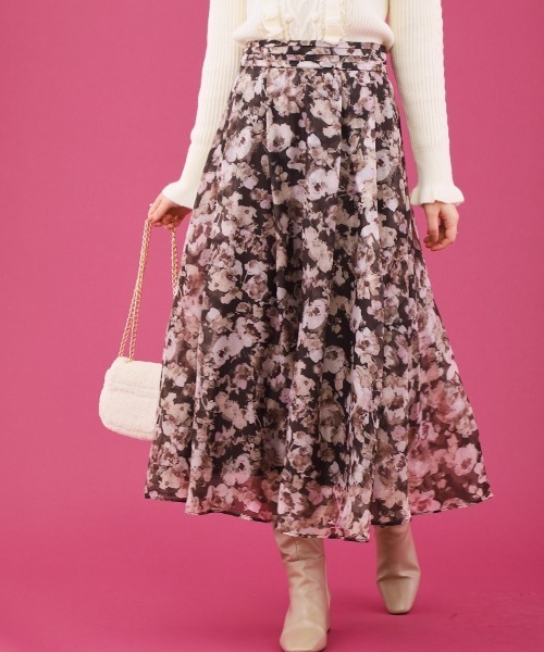ふわっと上品な花柄が目を惹く、ふんわり揺れ感が綺麗なオーガンジースカート ~POINT~ ・ウエストのタックベルトがアクセントになった、2タック花柄スカート。 ・ふんわりとした素材に水彩タッチの花柄がロマンティックな印象 ・ゆったりめのニットと合わせてもバランスよく着られるすっきりシルエットです。 ・冬のイベント、デートシーンにもおすすめな着映えスカート♪ 【ディティール・機能】 ・マットなオーガンジー面を表地に使用 ・裏地は程良い肉感のあるジャージ裏地 ウエストベルト裏はサテン裏地を使用しています。 ※裏地あり CBウエストゴム仕様・ファスナー開き ※ポケットなし 【スタッフコメント】 ・maki(163 ) 春夏も大人気だった、オーガンジー素材の花柄スカートが冬バージョンで新登場♪ ほんのりマットな質感が秋冬感を増してくれます。 今年トレンドのふわふわ系ニットで合わせてあげれば、クリスマスシーズンなどイベントにもピッタリ。 よりスッキリスタイリングするなら、リブニットもおすすめ◎ モデル情報:身長163cm B81 W56 H82 着用サイズ:38(M) 店舗へのお問い合わせ商品番号:508-77016 ●製品寸法: 36(S):総丈85cm W64cm 38(M):総丈87cm W67cm 40(L):総丈89cm W70cm 42(LL):総丈90cm W73cm 備考: