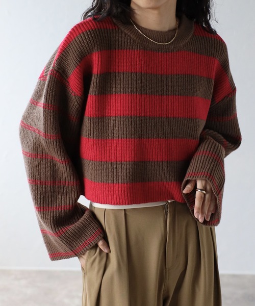 ♦切替ボーダーショートニットプルオーバー♦ 2つのピッチのボーダーを身頃と袖で組み合わせ、遊び心のあるニットに仕上げました。 ニットのボーダーでもほっこりしすぎないよう、あえてショート丈にしています。 ハイウエストやすっきりしたボトムスを合わせて頂くのがおすすめです。 ■MATERIAL ふんわりとした起毛感のある糸を使用しています。 ■手洗い可 ---------------------- 透け感:なし 伸縮性:なし 光沢感:なし ---------------------- 【注意事項】 ※サンプルで撮影しているため、実際の商品と仕様が異なる場合がございます。 ※商品画像は、撮影時の光の当たり具合やパソコンなどの閲覧環境により、実際の色味と異なって見える場合がございます。予めご了承ください。