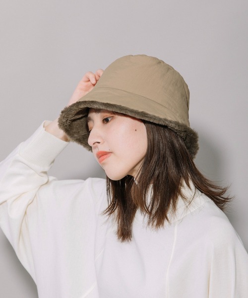□2023 AUTUMN & WINTER COLLECTION□【Direction to get mosh】◆スポーディなナイロンとやわらかなファー素材を組み合わせたバケットハット◆<MATERIAL>マットな風合いのナイロン生地。つばの内側は肌触りのなめらかなファー素材を組み合わせています。中綿入りでわずかにふっくらとした手触りです。<DESIGN>スポーディなナイロンとやわらかなファー素材を組み合わせたバケットハット。バックにあしらったドローコードのアウトドアなイメージと、ファー素材ののぞくつばのデザインが絶妙なバランス。パイピングのように見えるファーがアクセントになり、大人の女性も合わせやすいアウトドアテイストのバケットハットに。コードはほんの少しサイズを絞ることもできるので、フィット感の調節が可能です。普段使いにはもちろん、旅行や冬のレジャーシーンにもおすすめです。<COLOR>■アイボリー:女性らしい印象のアイボリー。顔まわりが明るく見えるカラーです。■ブラック:ベーシックなブラック。どんなコーディネートにも合わせやすいカラーです。■ベージュ:ブラウン寄りのベージュ。品よくまとまる色合いです。※光のあたり具合いやパソコンなどのモニター環境によって実際の色味と異なって見える場合がございますので、予めご了承ください。※着用商品はサンプルです。サイズ等の仕様に若干の変更がある場合がございますので、予めご了承ください。※お取扱いについては、商品についております品質表示、アテンションタグにてご確認ください。.............................≪INFORMATION ≫............................▼商品のお気に入り登録▼『♡』マークを押してお気に入り登録して頂いた商品は、セール開催の通知やクーポン発行などのキャンペーンなど、お得な情報をいち早く受けとる事が出来ますので、ぜひご登録ください。