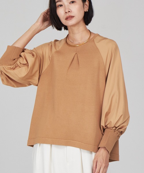 *Detail*一枚で華やかに演出してくれるニット。 フロントにタックを入れ、アクセントに。 袖口に細かなギャザーを施し、立体感とボリュームを出しました。 ドロップショルダーが女性らしいシルエットをつくり、エレガントな印象に叶えます。 *Coordinate* ニットとブラウスがミックスされたデザインブラウス。 テーパードパンツできれいめにも、デニム合わせでカジュアルにもオンオフでお楽しみいただけます。 袖口のリブでブラウジングさせ、こなれ感あるスタイリングに着こなすのがおすすめです。 アイボリー モデル:H170 B81 W59 H85 着用サイズ:F キャメル モデル:H170 B81 W59 H85 着用サイズ:F ブラック モデル:H170 B81 W59 H85 着用サイズ:F