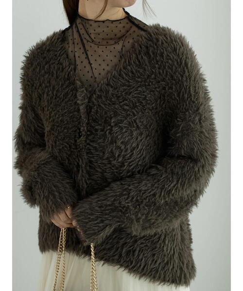 ずっとさわっていたくなるフワフワのシャギーニットで仕立てたカーディガン。 深めのVネックが抜け感をプラスし、顔周りをすっきりとした印象にみせてくれます。 あたたかな風合いと優しい肌触りが心地よく、肌寒くなる季節の変わり目も重宝すること間違いなし◎