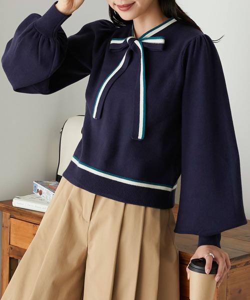 ボウタイリボンでレディな着こなしに 秋口から春先までロングシーズン着用できるデザインニット ・ボウタイリボンが上品な大人女性の印象をプラス ・コーデの主役になるデザイントップスは1枚で映える◎ ・トリコロールデザインがトラッドな印象に ・肌触りの良いモチモチニット素材で肌触り◎ ・ジャケットやジャンスカなどのインナーとしても重宝する程よい厚み ・ボリュームスリーブが女性らしいシルエットを演出 ----------- 透け感…なし 伸縮性…あり 光沢感…なし 生地の厚さ…ふつう 洗濯方法… 手洗い可能 ---------- ■取り扱い方法 この製品は、素材・編地の特性上、1着、1着、サイズのばらつき、風合い、色合い等が微妙に違います。あらかじめご了承ください。 ご着用時の激しい運動、摩擦や引っ掛かりやすいアクセサリーのご使用はお避け下さい。 ご着用時には、爪、指輪、時計、ヘアピンなどでひっかけないようにして下さい。 保管の際にはハンガーなどにかけ吊しておくと型くずれしやすいので必ず畳んで平らな状態で保管して下さい。 ※取り扱いについては、商品についている品質表示でご確認ください。 ※撮影画像は、光の当たり具合で色味が違って見える場合がございます。 また、ご覧になっているデバイスやモニター環境によって、実際の色味と多少異なって見える場合がございますので予めご了承をお願い致します。 ■着用レビュー コンパクトな着丈×ボリューム袖のシルエットが可愛いです。 サラッと1枚着るだけでコーデが華やかになるのが嬉しいです。 女性らしいデザインですが、細めのボウタイリボンでカジュアルなコーデとも相性が良く、色々なシーンで活躍しそうです! ≪お買い物をお楽しみいただくために≫ ▼商品のお気に入り登録 完売カラーの再入荷通知や、ラスト1点の通知、セールの通知も受け取ることができます。 ▼ブランドのお気に入り登録 新商品や再入荷等、いち早くブランドのお得な情報を受け取ることができます。