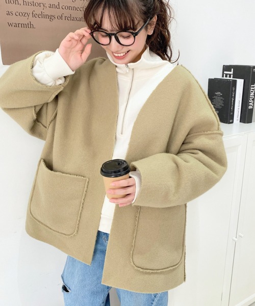 ★New Arrival★ 【2つの異なる風合いを楽しめる◎さっと羽織って様になる万能リバーシブルアウター】 ◆Design ・あたたかみのある表面感が魅力。ミドル丈×ノーカラーデザインがコーデを大人っぽく仕上げる、着回し力抜群の一着。 ・片面は上品な生地感にアウトリンキングをアクセントに。もう片面はカールした毛足のほんのりフェミニンな雰囲気をポイントに。 ・手軽に羽織りやすいゆったりとしたサイズ感とシルエット、ドロップショルダーでこなれ感たっぷりのバランスに仕上げました。 ・軽やかな着心地とあたたかさを両立◎インナー次第で秋冬に長くご着用いただけます。 ◆Fabric ・暖かみある表情と起毛感が魅力の、シーズンムード高まるフェイクリングウール。 ・肌触りの良いウールライクな素材が、上品な風合いで高見えを実現。 ◆Styling ・ミドル丈なので全体のバランスが取りやすく、幅広いボトムスと相性抜群◎ ・スラックスやデニムにきれいめブールで大人カジュアルにも。マーメイドスカートで上品にも。 ・顔まわりをすっきりと魅せるノーカラーなので、ハイネック、ボーダー、カラーアイテムなど合わせるインナーによって雰囲気を変えて楽しめます。 ~~~~~~~~~~~~~~~ 生地の厚み ふつう 生地の透け感 なし 生地の伸縮性 ややあり 生地の光沢感 なし ポケット 片面あり 裏地 なし ~~~~~~~~~~~~~~~ ※商品画像は着用イメージです。光や角度により、実物と色味が異なる場合がございます。 また表示のサイズ感も実物とは若干異なる場合もございますので、予めご了承ください。 ※着用、お取り扱いの際は、商品に付いている品質表示とアテンションタグを必ずご確認ください。 ※サイズは平置き寸法で表記しております。着用により素材の重みで丈感や袖が表記より長くなる場合がございます。 【moment+/モーメントプラス】その瞬間にこの1着と――― より豊かで充実したライフスタイルを目指して、手軽にトレンドかつベーシックな着回せるアイテムをプチプライスで提供していきます。 ≪お買い物をよりお楽しみいただくために♪≫ ♡商品のお気に入り登録 完売カラーの再入荷通知や、完売間近の通知、セールの通知を受けることができます。 ♡ブランドのお気に入り登録 新商品や再入荷など、いち早くブランドのお得な情報を受け取ることができます。